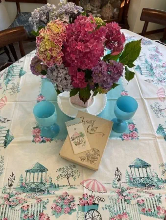 The Vintage Tablecloth Lovers Club (VTLC) was established in the late summer of 2002 by enthusiasts of 1930's - 1970's vintage printed tablecloths. The purpose of the club is to promote the education and appreciation of these pieces of "Kitchen Textile Art" from our past, as well as to have fun sharing our hobby and creating lasting friendships. Please explore all the tabs on this website home page. Becoming a paid member provides access to our searchable database of approximately 3000 vintage tablecloths, providing information about manufacturer, designer, pattern name, etc. This is the only one of its kind in the world. In addition, we have an archive of another 1500 or so tablecloths with the original paper labels, wonderful research articles written by members, monthly on-line tablecloth sales reports, member activities and more as evidenced on the site map. Our forum and live chat options are available to all and offer in-depth conversation beyond the more common social media types. Just choose the “Join Club” tab at the top and follow the prompts.If you have questions or need some help in some way, send a quick email to info@vintagetableclothloversclub.com.The VTLC is a not-for-profit club. The $30.00 a year dues are collected to offset the maintenance of the club and special club activities.