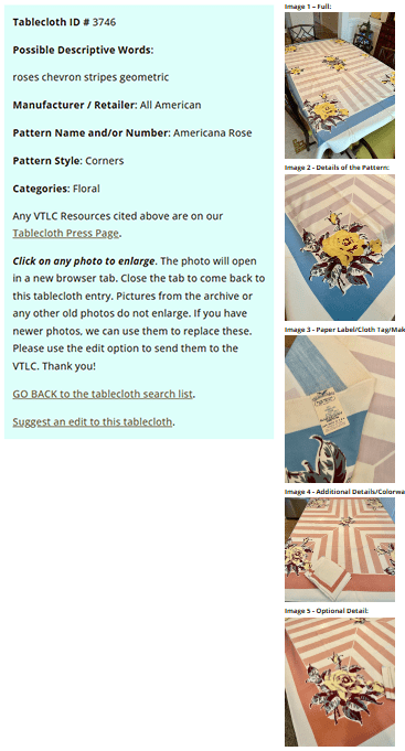 Members can explore patterns, identify unknown tablecloths, learn about designers and production eras, and discover the stories behind the fabrics that once decorated tables across generations. Whether you are a collector, seller, researcher, or simply someone who appreciates the beauty of vintage linens, this database provides an invaluable reference you will not find anywhere else.